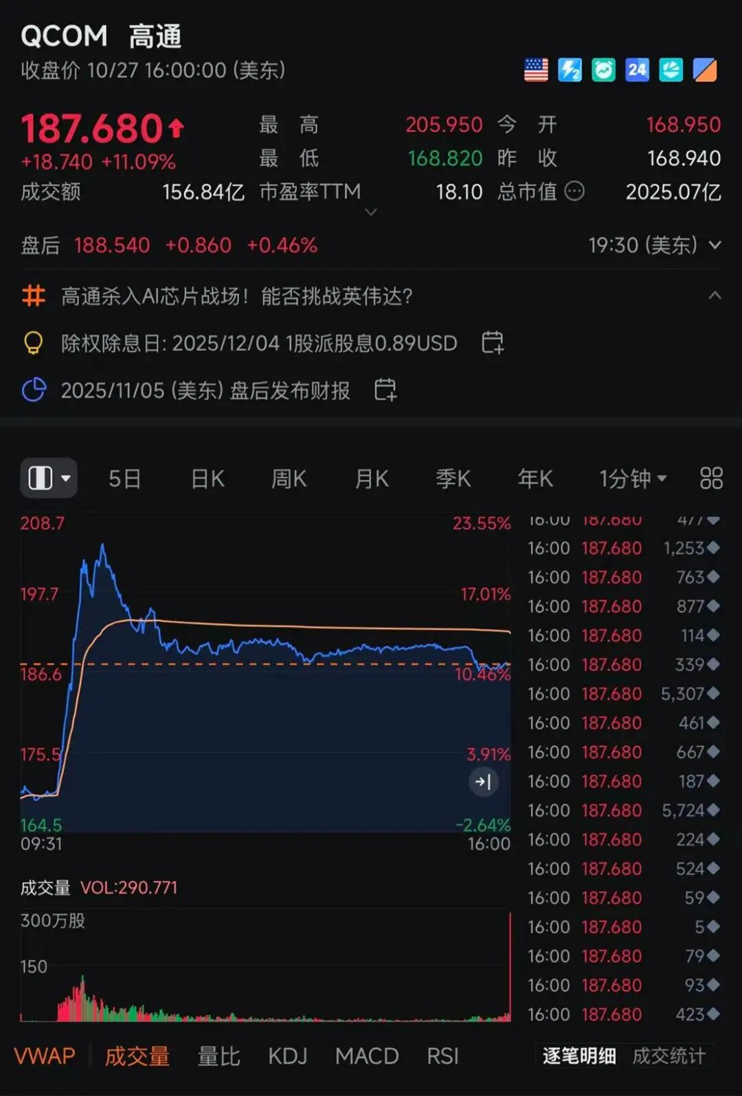 个股方面,高通涨超11%,创2024年7月以来新高。消息面上,公司推出人工智能芯片,在数据中心市场与英伟达展开竞争。