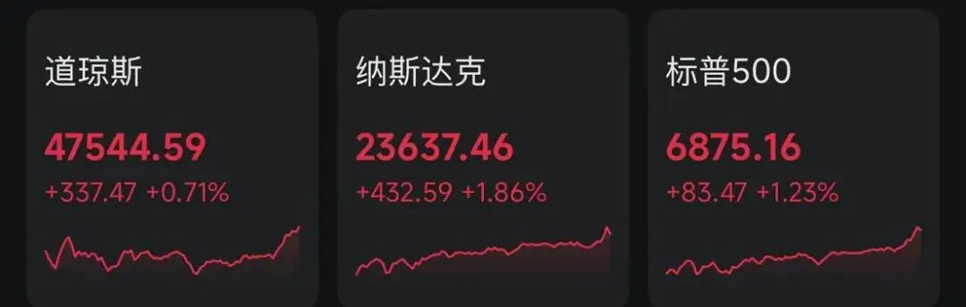 当地时间周一,美股市场表现“火热”,三大指数齐创新高。截至收盘,道指涨0.71%,报47544.59点;纳指1.86%,报23637.46点;标普500指数涨1.23%,报6875.16点。