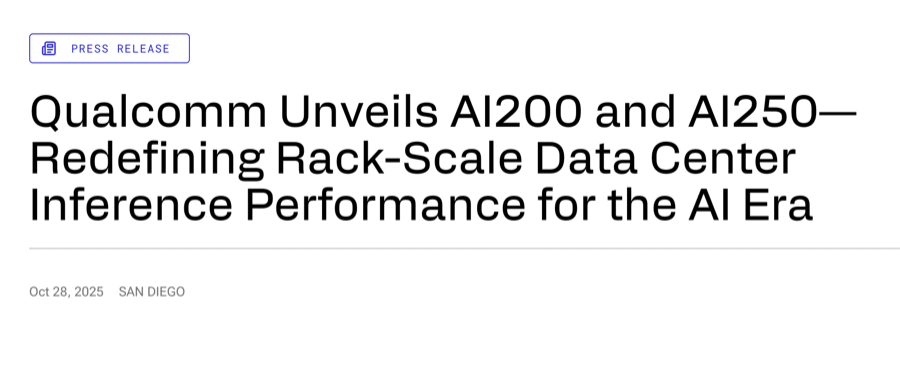 高通发布其新一代数据中心AI推理优化解决方案:基于高通AI200和AI250芯片的加速卡和机架。高通AI200是专为机架级AI推理设计的解决方案,旨在提供低拥有总成本(TCO)和优化的性能,用于大型语言和多模态模型(LLM、LMM)推理和其他AI工作负载,每张卡支持768GB的LPDDR内存。高通AI250解决方案将采用基于近内存计算(near-memory computing)的创新内存架构,通过提供超过10倍的内存带宽提升和降低功耗,为AI推理工作负载带来更高的效率与性能。这被认为将与英伟达竞争。
