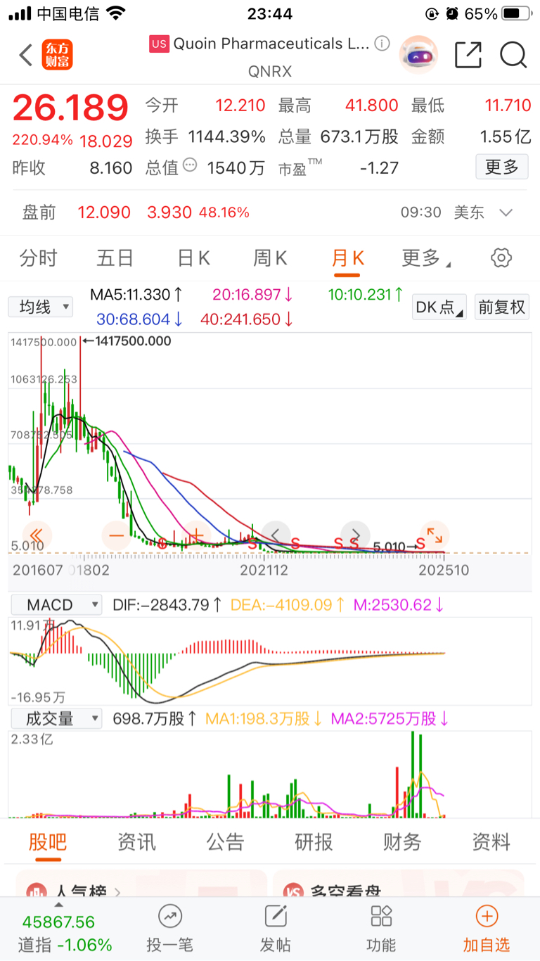 $Quoin Pharmaceuticals Ltd ADR(NASDAQ|QNRX)$ 142万跌到26元,太奇葩了。#收盘点评#
