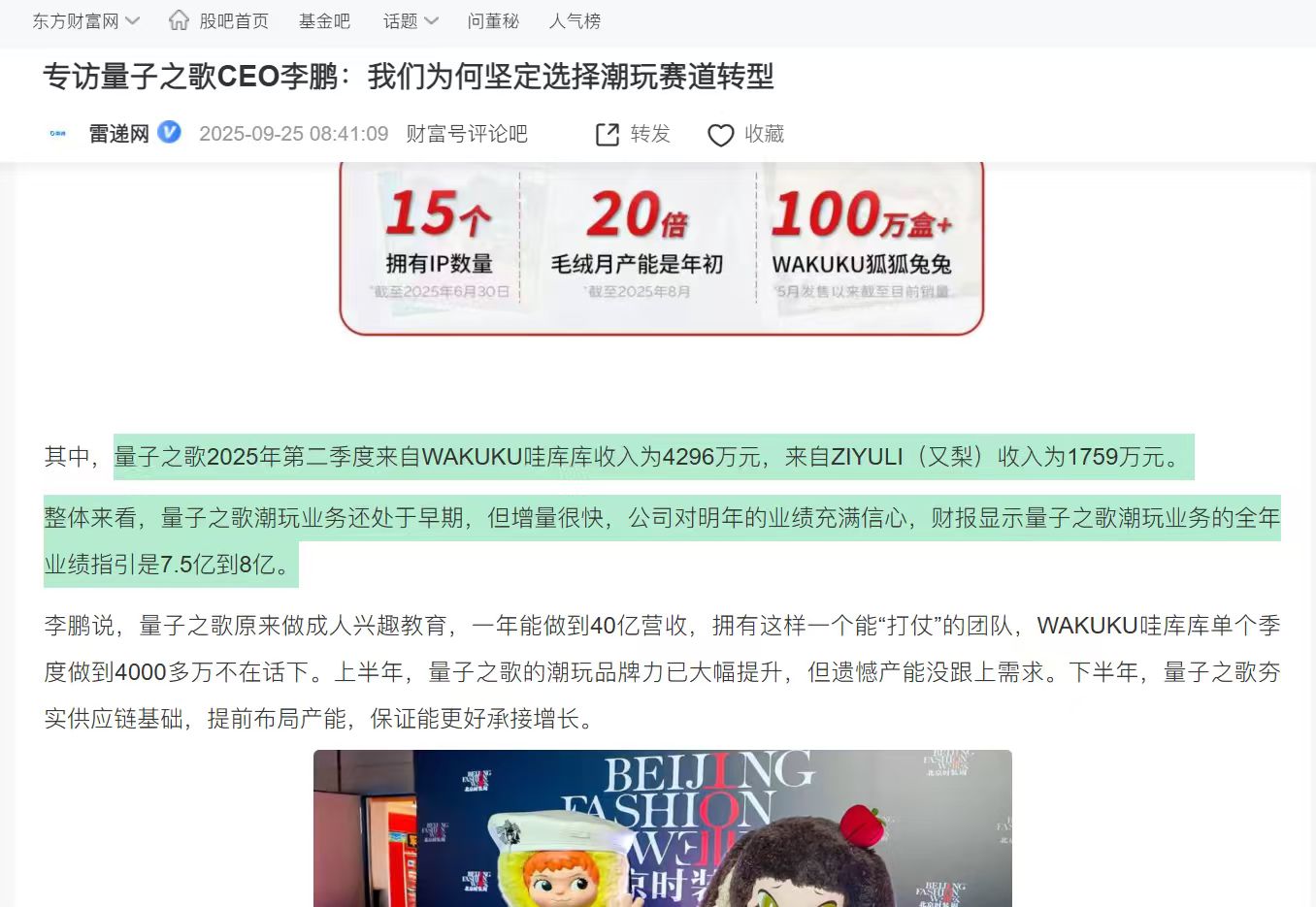 量子之歌对潮玩业务的全年指引是7.5亿到8亿