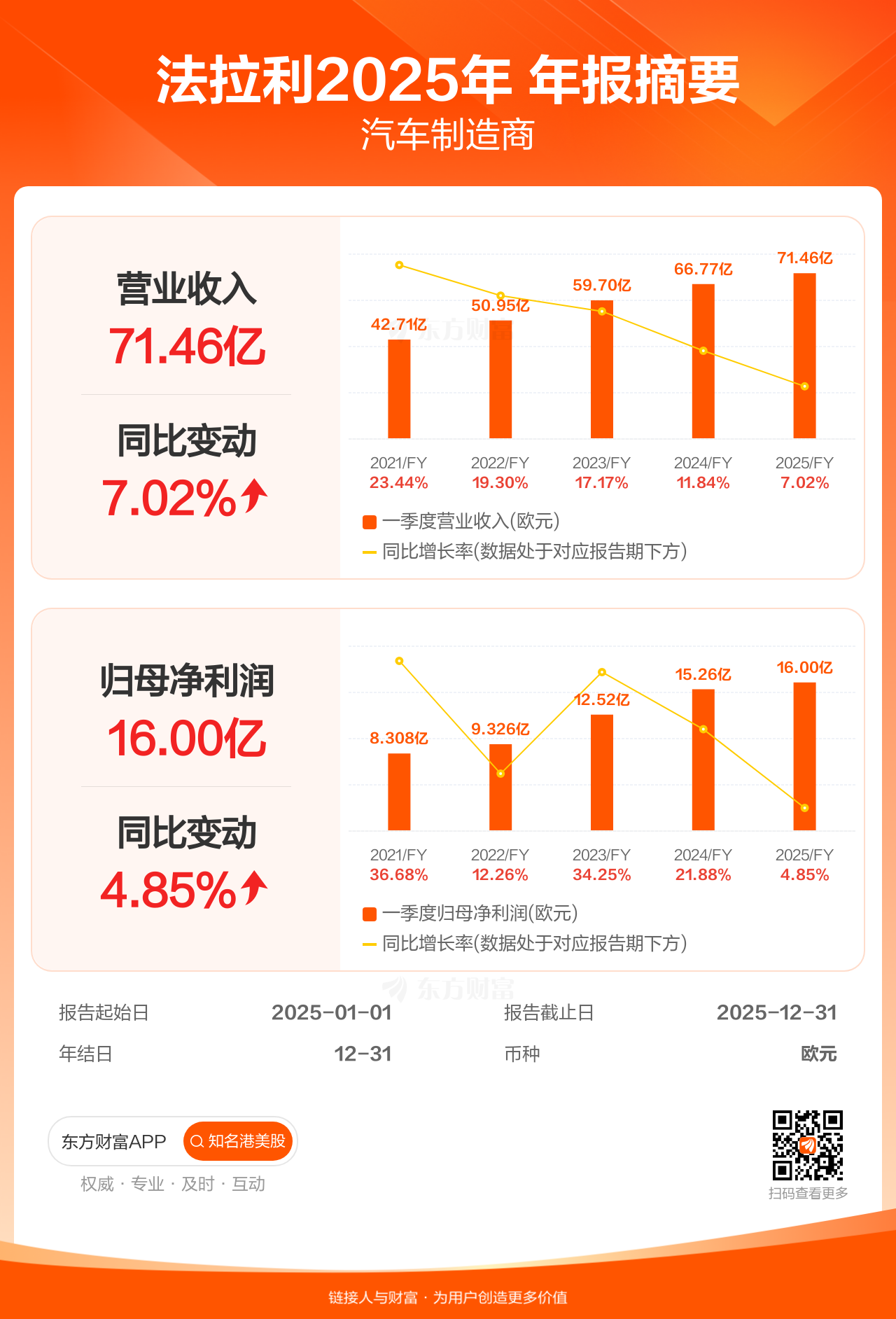 法拉利2月10日发布年报业绩,截至2025年12月31日的12个月内,该公司营业收入71.46亿欧元,同比增长7.02%;公司权益持有人应占溢利(归母净利润)16.00亿欧元,同比增长4.85%,低于机构一致预测的143.16亿欧元。