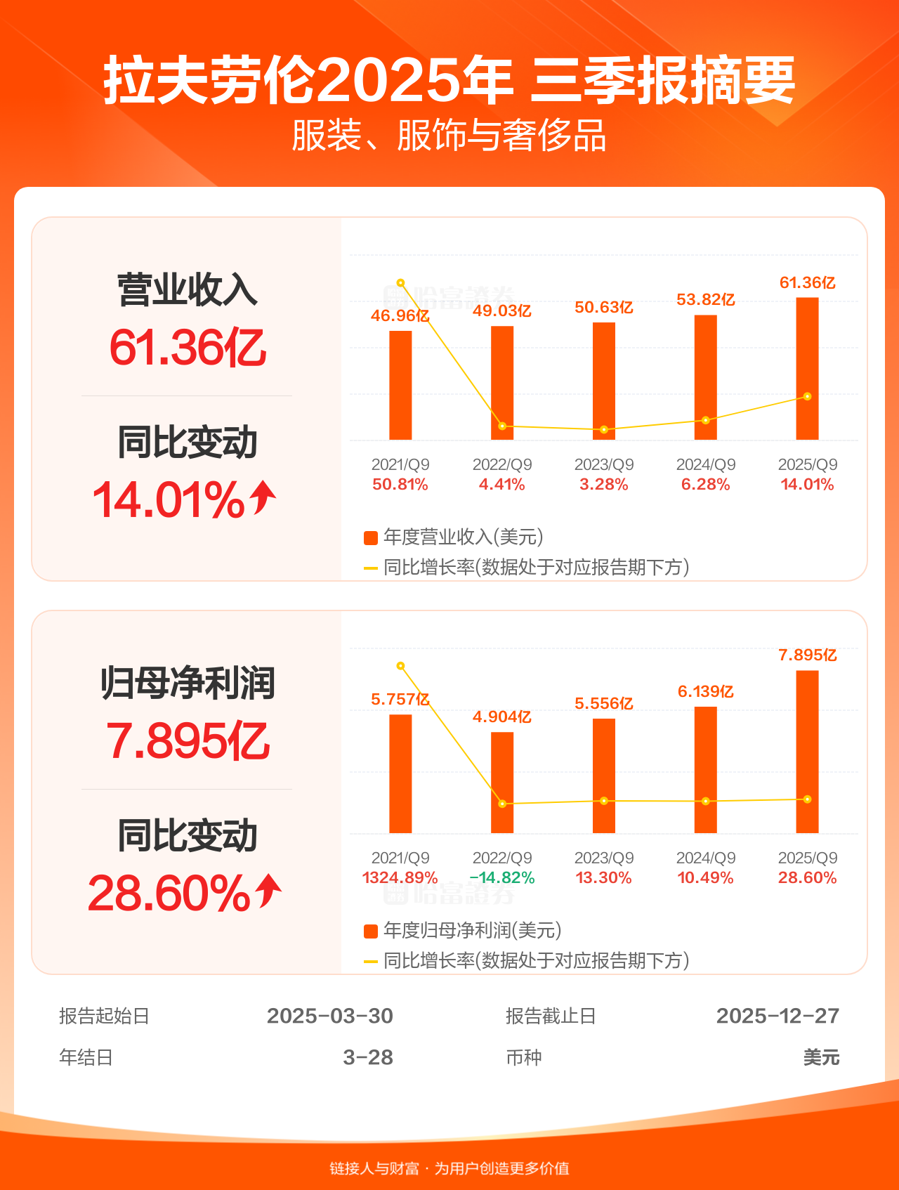 拉夫劳伦2月5日发布三季报业绩,截至2025年12月27日的9个月内,该公司营业收入61.36亿美元,同比增长14.01%;公司权益持有人应占溢利(归母净利润)7.90亿美元,同比增长28.60%。