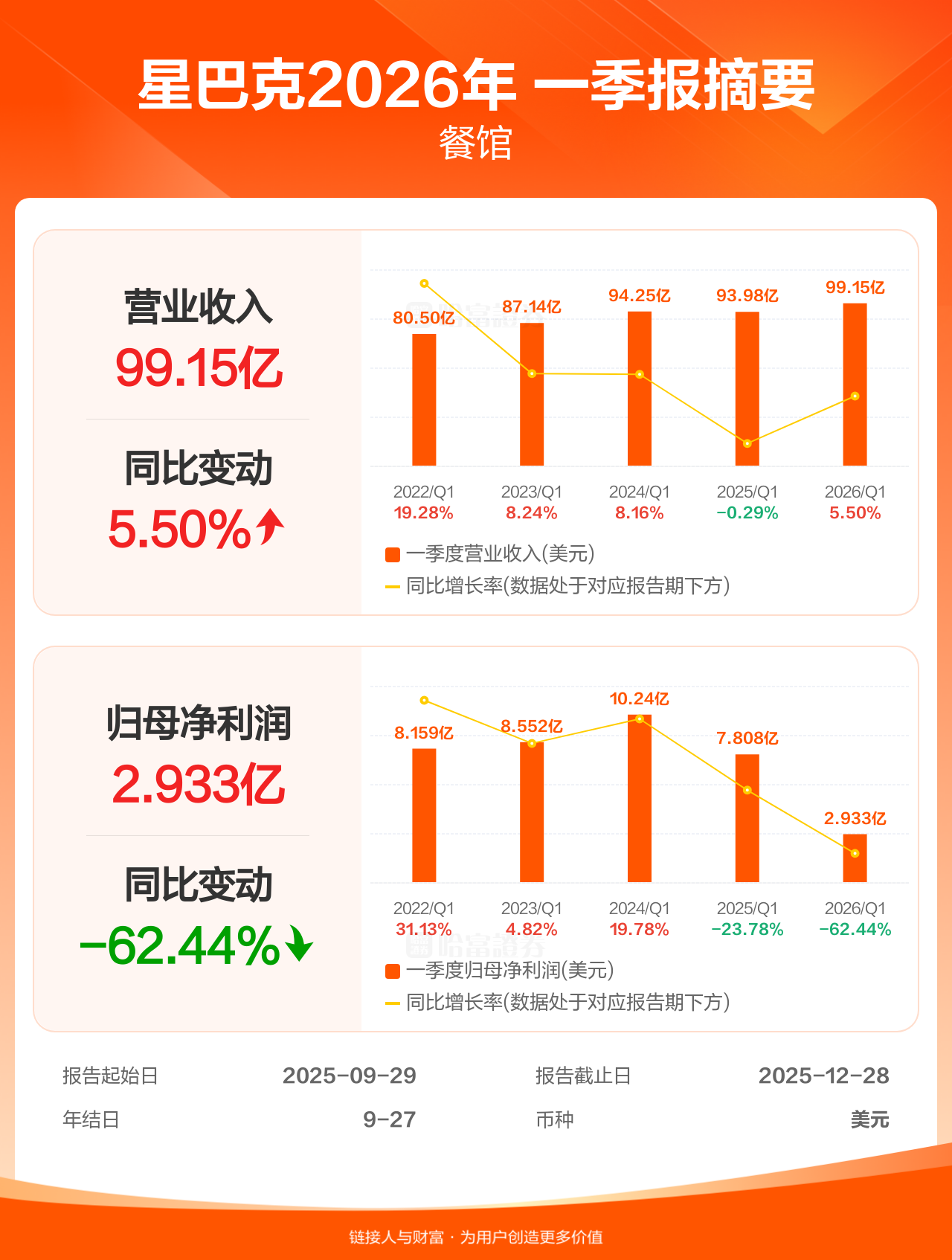 星巴克1月28日发布一季报业绩,截至2025年12月28日的3个月内,该公司营业收入99.15亿美元,同比增长5.50%;公司权益持有人应占溢利(归母净利润)2.93亿美元,同比减少62.44%。