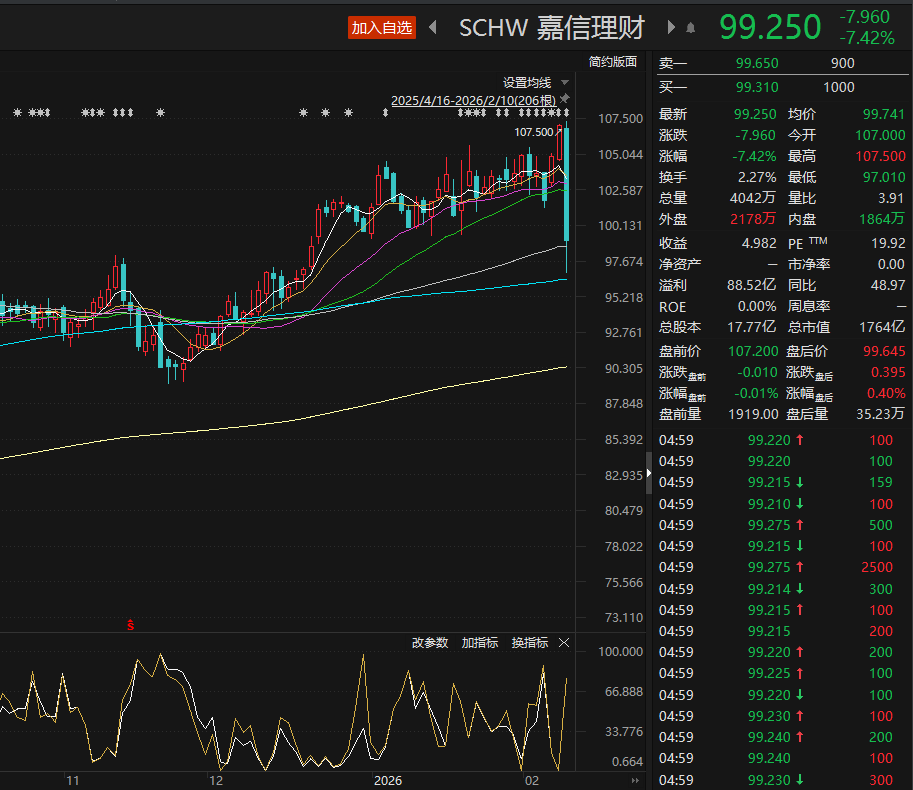 具体来看,金融服务巨头嘉信理财2月10日股价大跌7.42%,该公司是美国最大的零售金融服务公司之一,管理着超11万亿美元客户资产。
