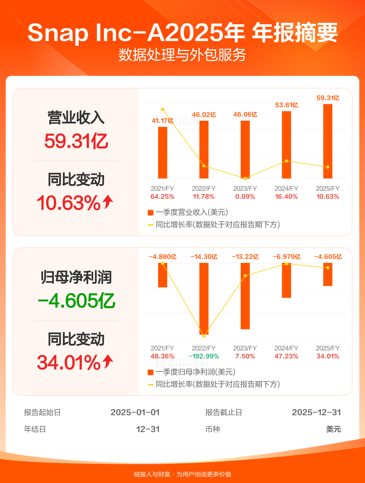 Snap Inc-A2月4日发布年报业绩,截至2025年12月31日的12个月内,该公司营业收入59.31亿美元,同比增长10.63%;公司权益持有人应占溢利(归母净利润)-4.60亿美元,上年同期-6.98亿美元。