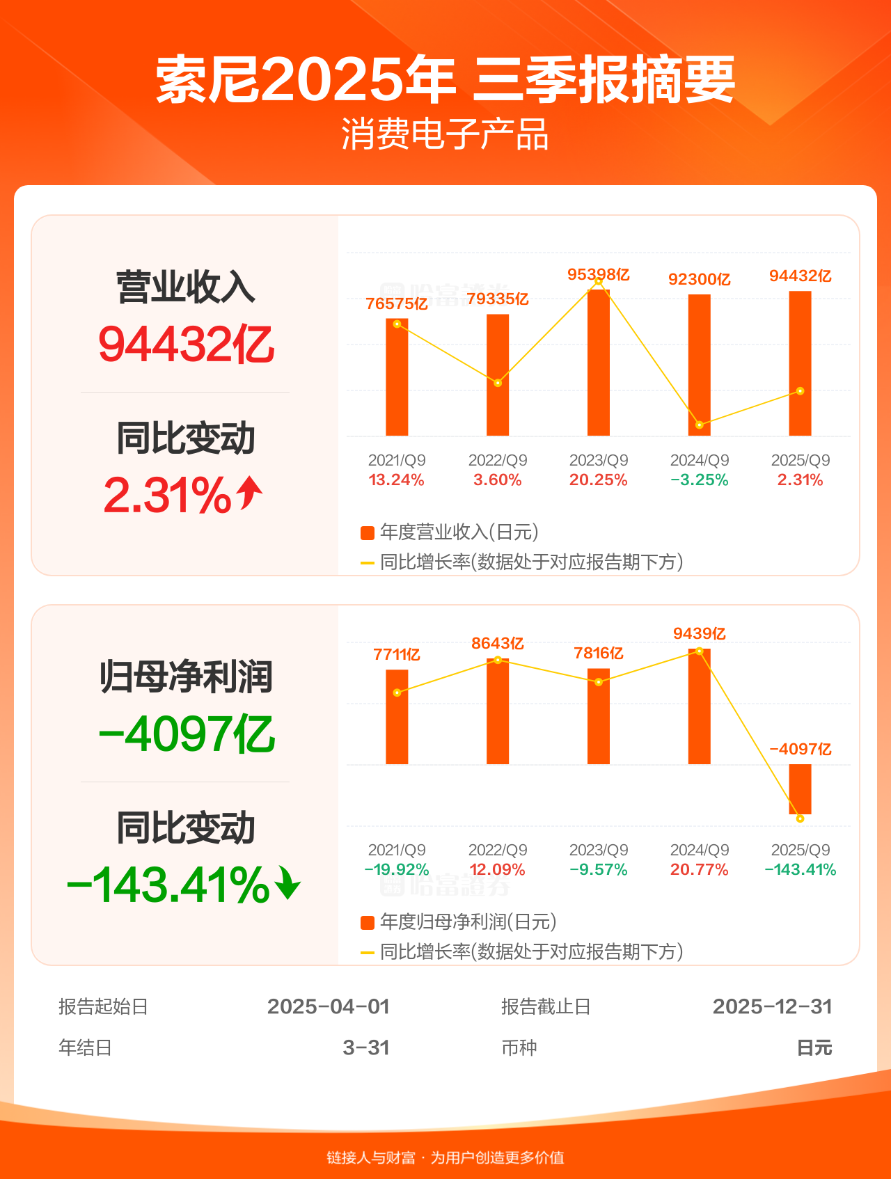 索尼2月5日发布三季报业绩,截至2025年12月31日的9个月内,该公司营业收入9.44万亿日元,同比增长2.31%;公司权益持有人应占溢利(归母净利润)-4097.35亿日元,上年同期9438.73亿日元。