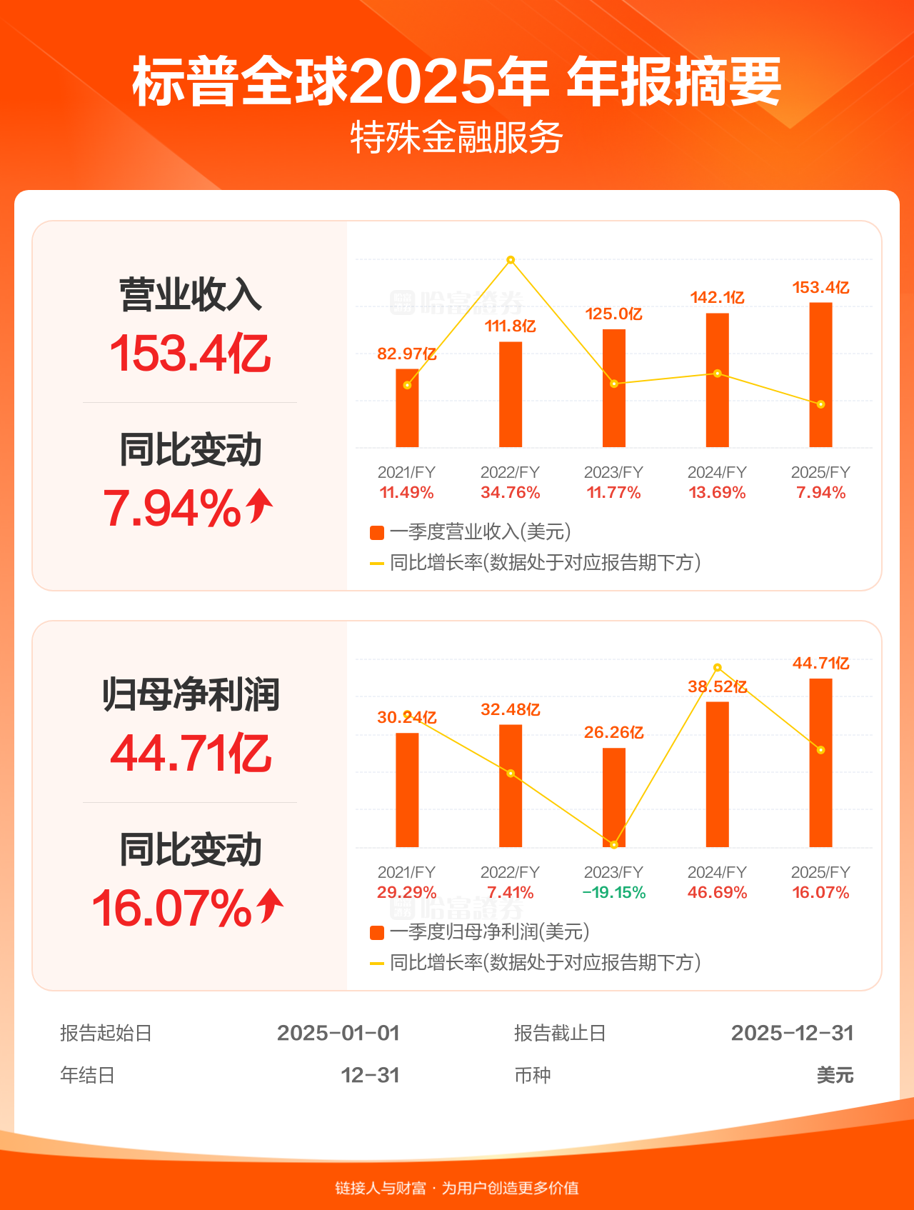 标普全球2月10日发布年报业绩,截至2025年12月31日的12个月内,该公司营业收入153.36亿美元,同比增长7.94%;公司权益持有人应占溢利(归母净利润)44.71亿美元,同比增长16.07%