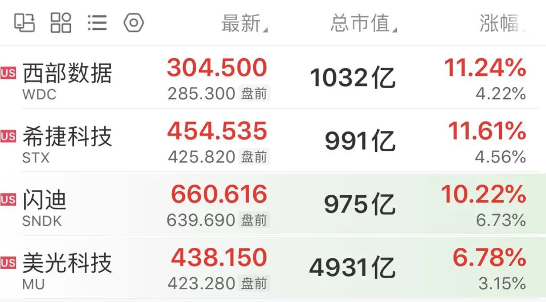 盘面上,存储概念股早盘集体爆发,其中,希捷科技、西部数据涨超11%,闪迪涨超10%,美光科技涨近7%。