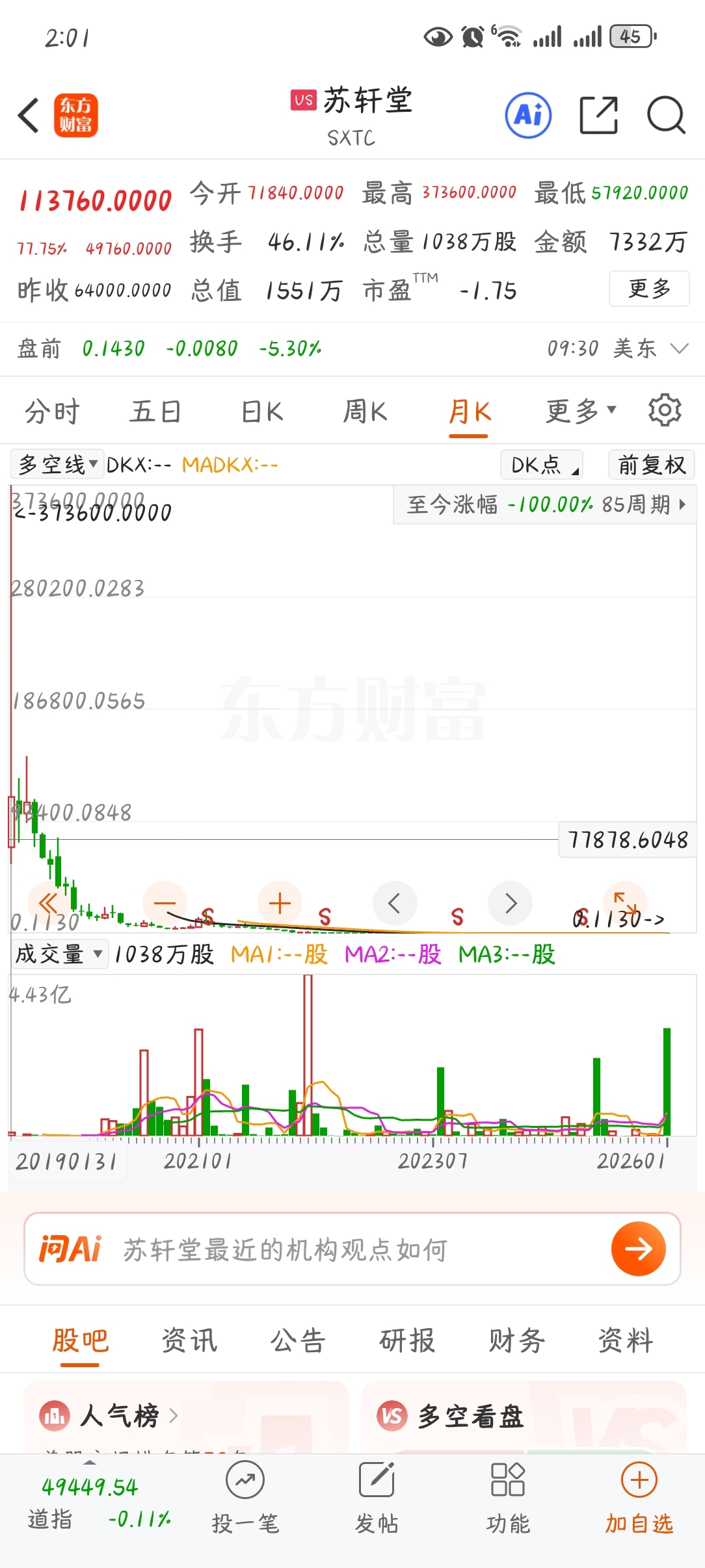 $苏轩堂(NASDAQ|SXTC)$ 最高点373600元一股,落魄到0.13元一股