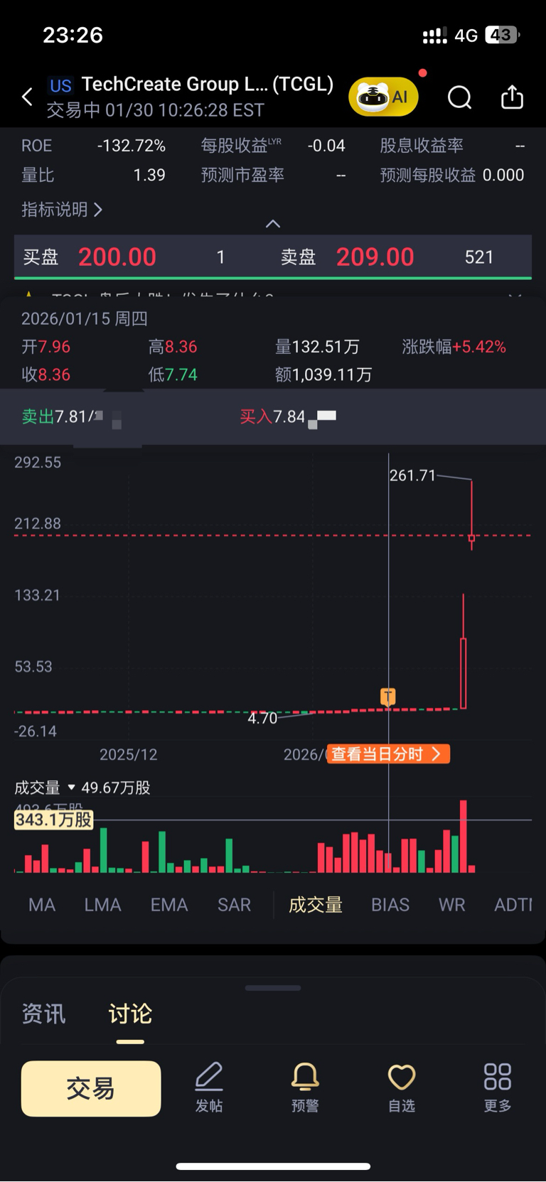 $TechCreate Group Ltd-A(AMEX|TCGL)$ 这波我错过了一次暴富的机会咯!30-40倍!昨天盘后干到450美刀!7.85成本 50多倍呀!就算是现在卖也有30倍!哎!看来偶尔格局一下也不错!美股就是这个爽!开盲盒感觉!有惊喜!