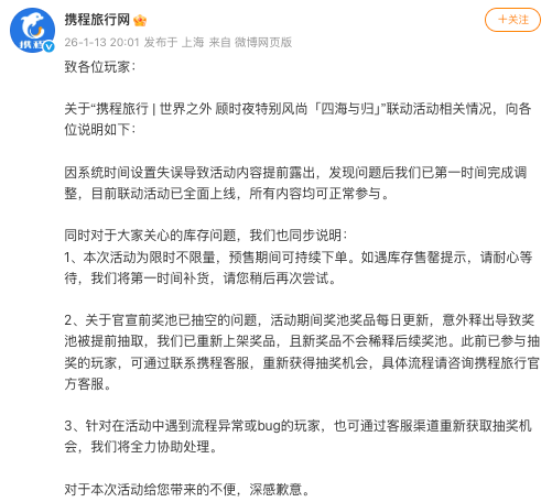 1月13日,@携程旅行网发文称,关于“携程旅行 | 世界之外顾时夜特别风尚「四海与归」”联动活动相关情况,向各位说明如下: