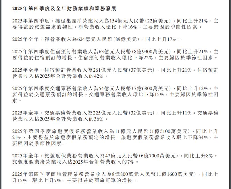 公告显示,2025年第四季度,携程集团净营业收入为154亿元,同比上升21%,主要得益于旅游需求的韧性,净利润为43亿元。净营业收入环比下降16%,主要归因于季节性因素。
