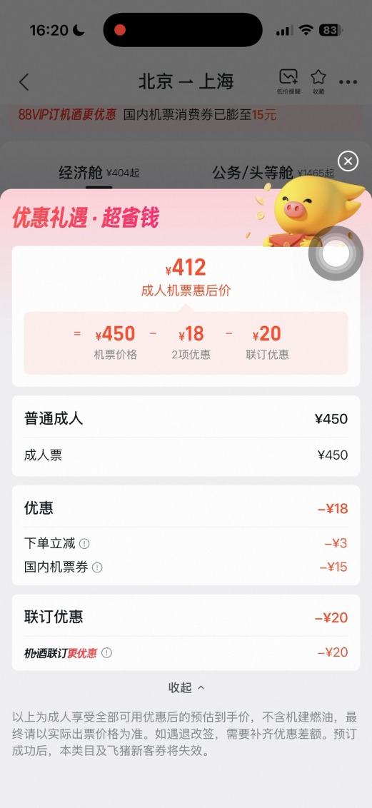 但在这几个计算步骤里,看似都和最初显示的404元没有关系。记者计算发现,404元的得出是由450元基础票价和“4项最至高减46元”的所谓“优惠”相减构成,即上述26元的优惠加上20元的机酒连订优惠。