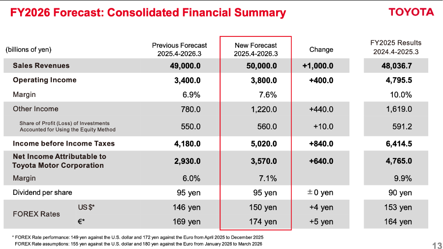 即便身处行业转型的复杂环境,丰田管理层仍展现出对盈利修复的信心,还上调了2026财年的全年财务预期:将全年营业利润预期从3.4万亿日元调高至3.8万亿日元;全年销售净额预期从49万亿日元调至50万亿日元;全年净利润预期更是从2.93万亿日元上调至3.57万亿日元。