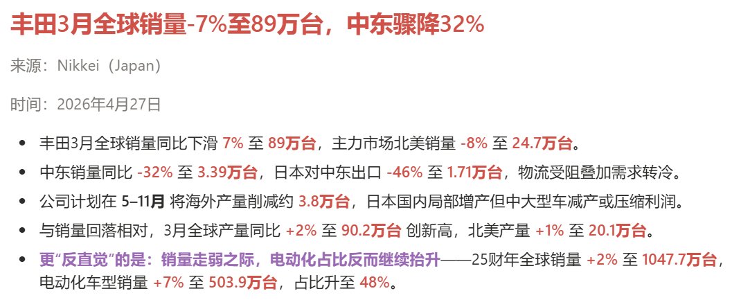 3月丰田全球销量-7%,除了印度是增长,在其他主要市场基本都是下跌,其中中东由于伊朗局势拖后腿最明显