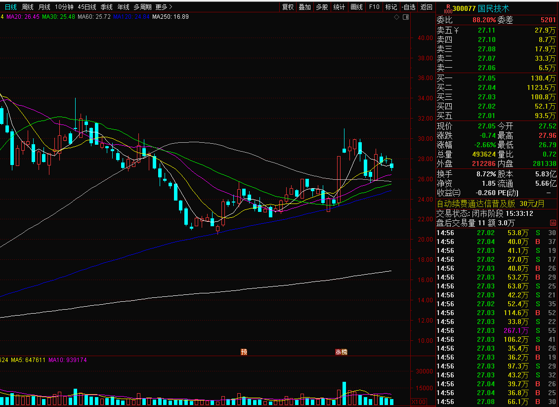 国民技术300077:半导体,目前弱势震荡,今天被市场拖累,继续维持弱势震荡,继续缩量,目前量能已经接近前期地量,已经跌无可跌,量缩不可缩,下周一旦市场重新发起3400冲锋,AI科技爆发,该股有望收到姿金流入开启反弹,而且下方26的强支撑,洗盘后反弹很容易反包这两天的小阴线。先继续等等。
