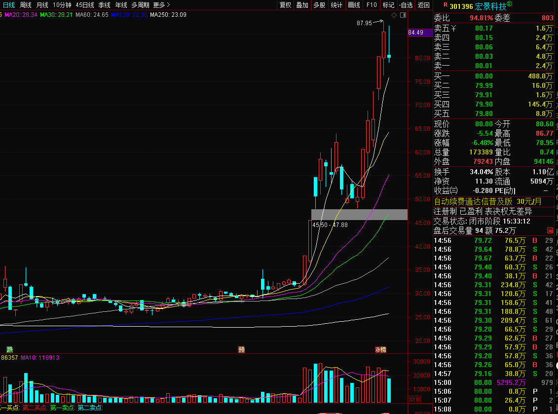 宏景科技301396:宏景今天被市场第四次冲击3400遇阻后拖累震荡回落,收阴线,但下方趋势支撑依然没有跌破,趋势依然向上运行轨迹没有发生变化,下周支撑上移,市场一旦重新蓄力拉升看能否反包,重新延续升浪趋势,如果转弱跌破均线支撑就高位离场。