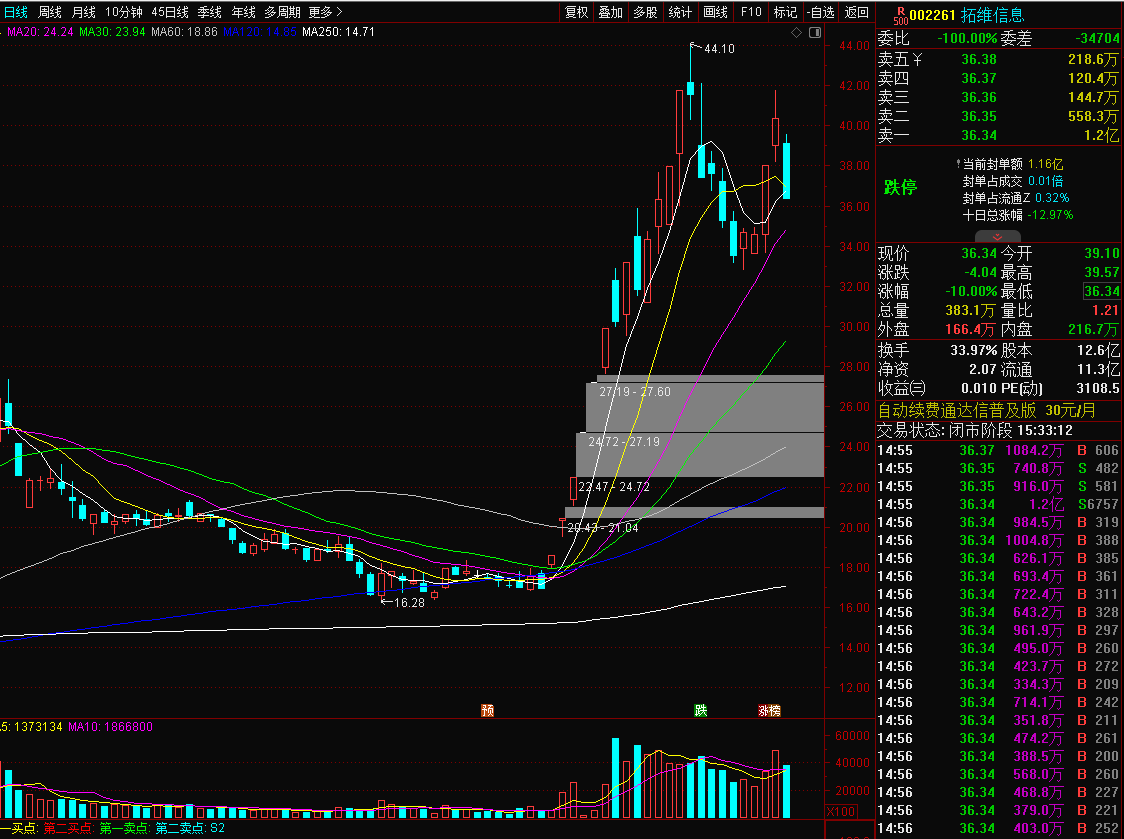 拓维信息002261:拓维是机器人+deepseek概念,老龙头,拓维今天低开震荡回落,从昨天的拉升不封板就已经看出上涨力量不是很强,可能会有震荡蓄力可能,今天加上市场弱,临近周五冲压力失败,调整在心里预期范围,只是没想到会跌停,但该股34的强支撑我认为不会破,区间震荡,下周板块继续爆发,有反包重新拉升可能,大概率会维持区间这都能,就看AI科技能否加大爆发力度带动突破前高了,先观察一天看下周一能否企稳止跌。