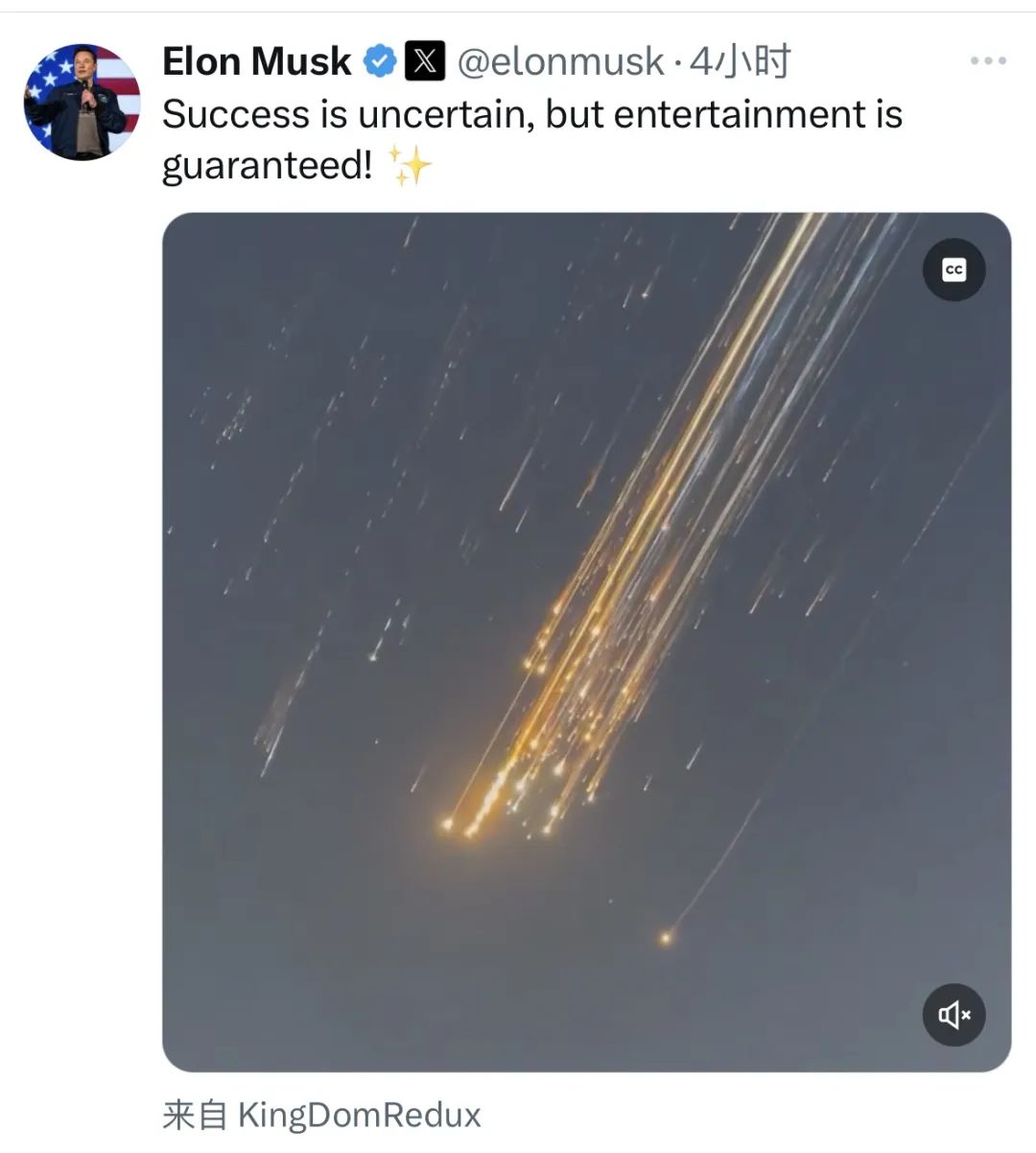 “成功是不确定的,但娱乐是有保证的!”马斯克对“星舰”第七次试飞的结果评论说。