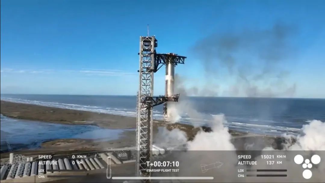 2024年11月,SpaceX“星舰”进行了第六次综合测试飞行试验。发射顺利升空,但一级助推火箭在返回的时候出现问题,没有尝试“筷子夹火箭”,而选择降落在墨西哥湾,火箭在接近海面时发生爆炸。飞船完成首次“在轨点火试验”,完整降落在了印度洋预定海域。