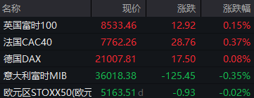 德国DAX指数跌0.13%,英国富时100指数涨0.01%,法国CAC指数涨0.09%。