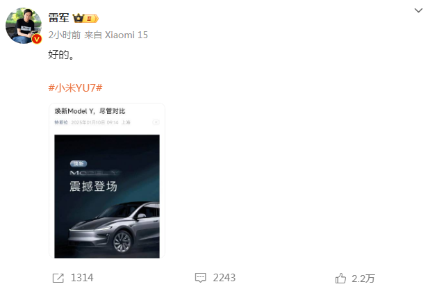 值得一提的是,1月10日,特斯拉官微发布消息,宣布推出焕新Model Y,宣传语为“焕新Model Y,尽管对比”。对此,雷军发布微博称“好的”。据报道,小米汽车第二款车型、首款SUV车型-YU7将于6月前后上市。