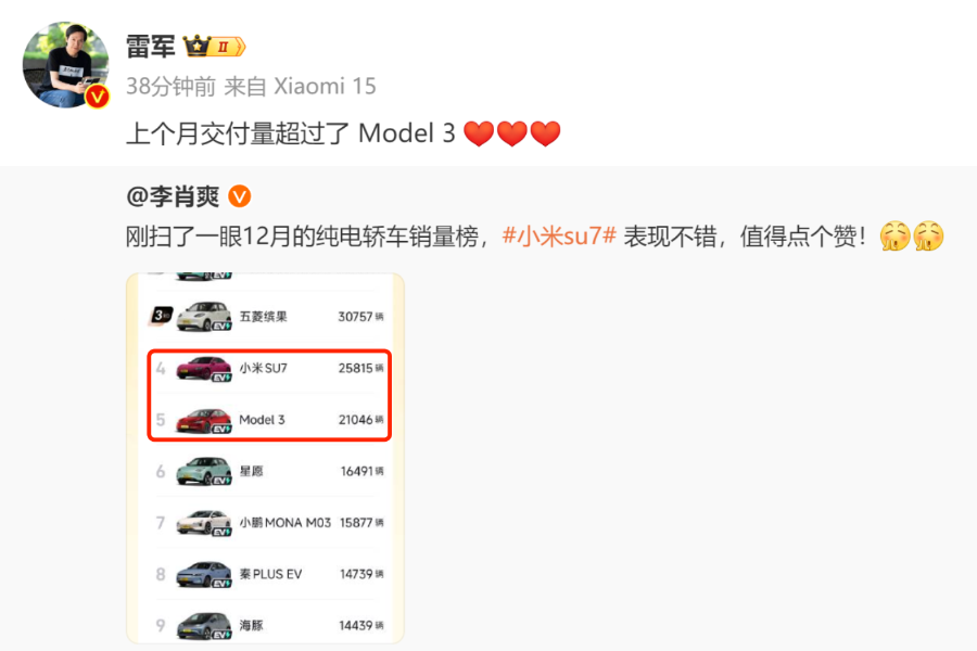1月21日,小米集团董事长兼CEO雷军转发小米汽车副总裁李肖爽微博,并称小米SU7上个月交付量超过Model 3。李肖爽贴出的纯电轿车销量榜显示,2024年12月,小米SU7销量为25815辆,排名第五;特斯拉Model 3销量为21046辆,排名第六。排在前三的分别为比亚迪海鸥、五菱宏光MINIEV、五菱缤果。