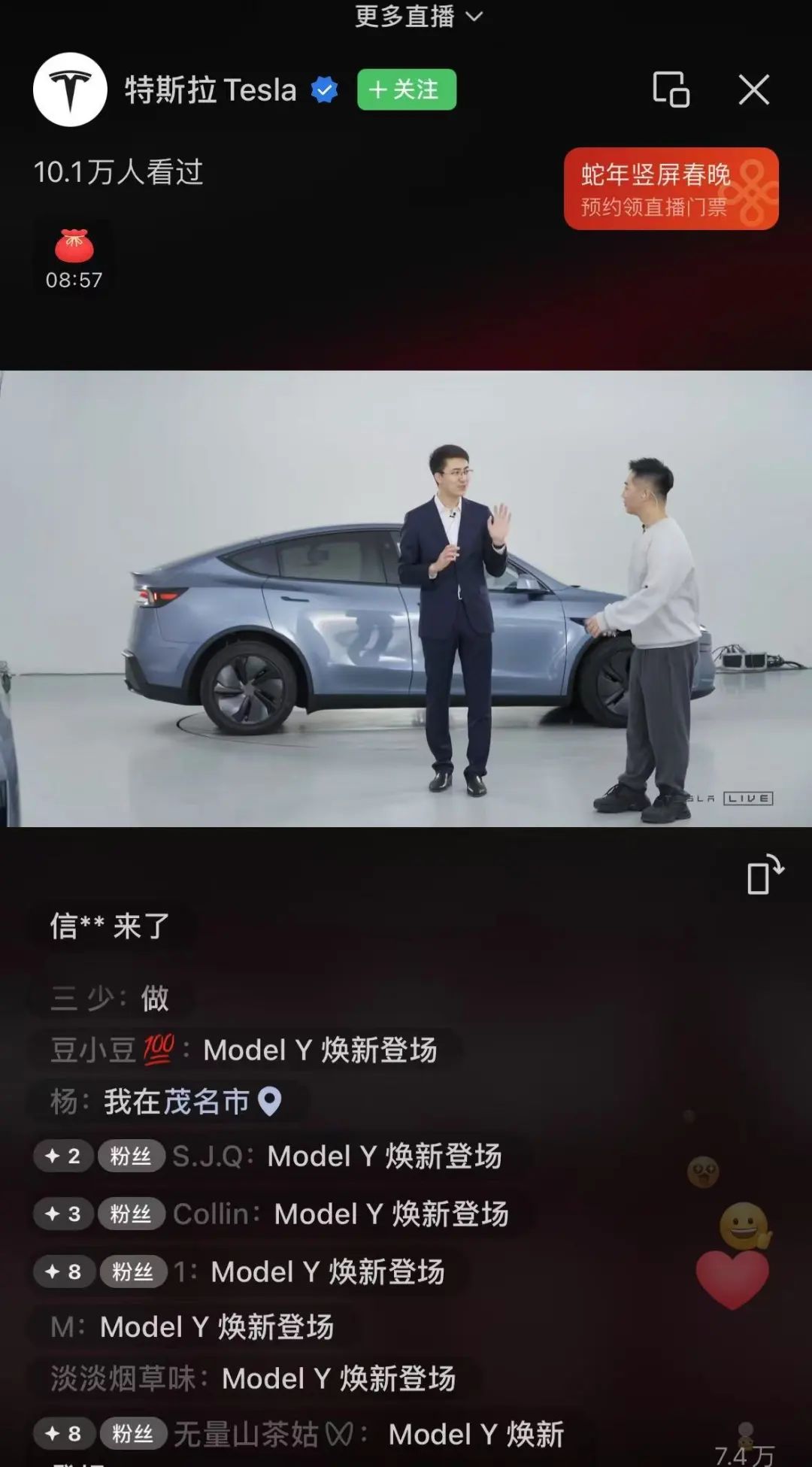 1月24日上午,特斯拉通过直播形式正式展示了焕新Model Y实车。特斯拉官方公众号显示,超10万人进入直播间观看。