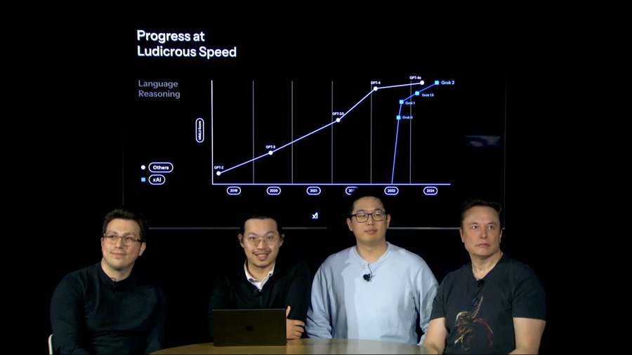 团队成员一开场就介绍,虽然Grok起步较晚,但在衡量大语言模型性能的指标MMLU得分上以超快的速度追上了ChatGPT。