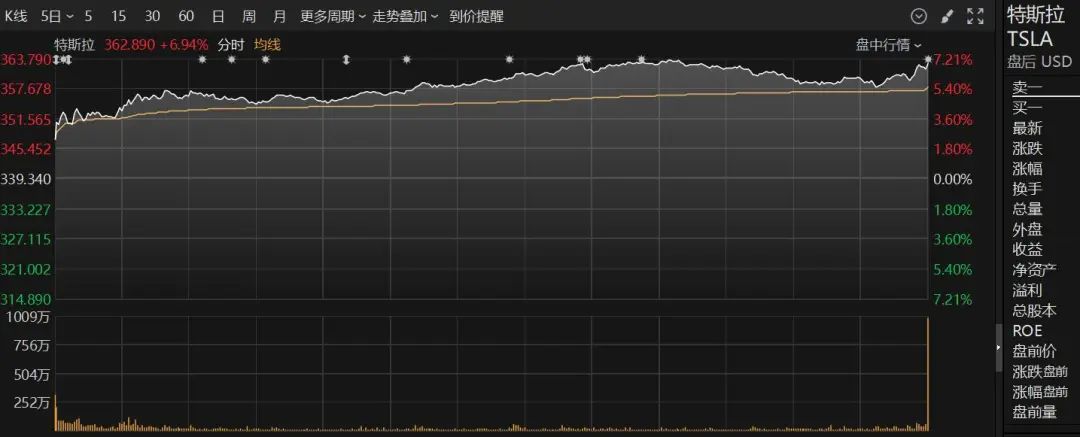 大型科技股普涨,特斯拉涨近7%,英伟达涨超3%,苹果、微软、亚马逊、谷歌、Meta涨超2%。
