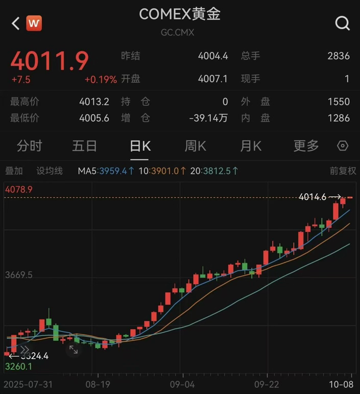 10月7日,黄金的热度仍在持续。伦敦现货黄金涨0.59%,报3984.14美元/盎司,盘中一度涨破3990美元,创历史新高。纽约期金则首次站上4000美元/盎司大关。COMEX黄金期货涨0.71%,报4004.4美元/盎司。