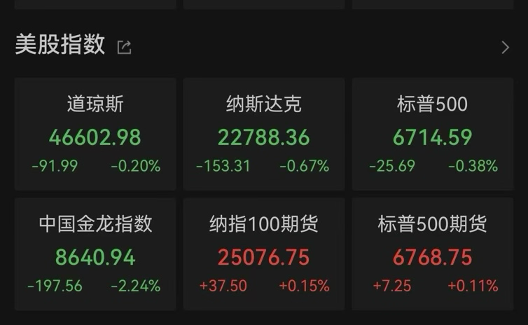周二,美股三大指数集体收跌。其中,道指跌0.2%报46602.98点,纳指跌0.67%报22788.36点,标普500指数跌0.38%报6714.59点,