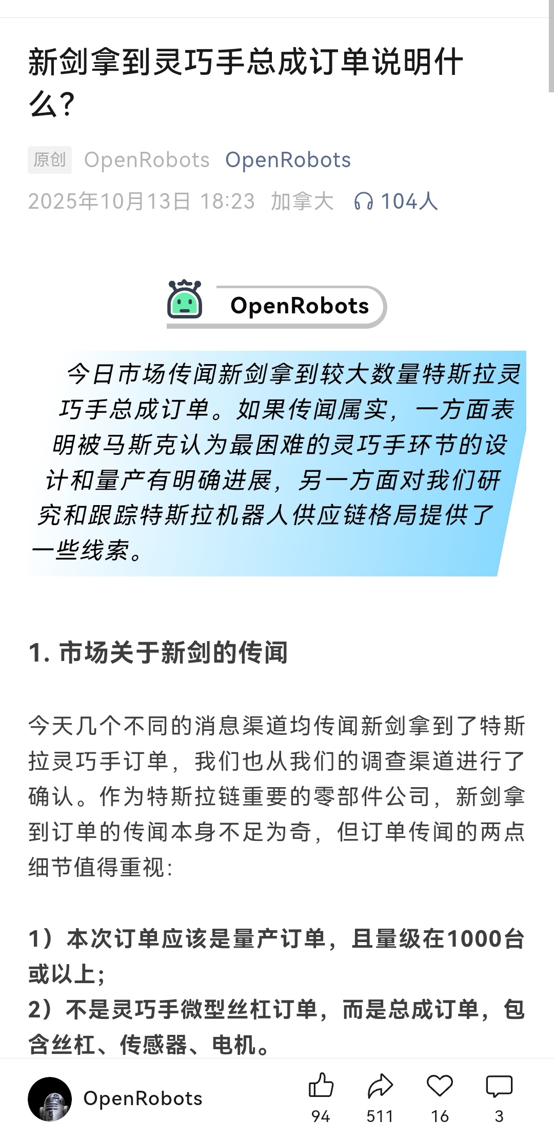 $特斯拉(NASDAQ|TSLA)$ $日盈电子(SH603286)$ 新剑拿到较大数量特斯拉灵巧手总成订单,特斯拉optimus灵巧手有重大进展