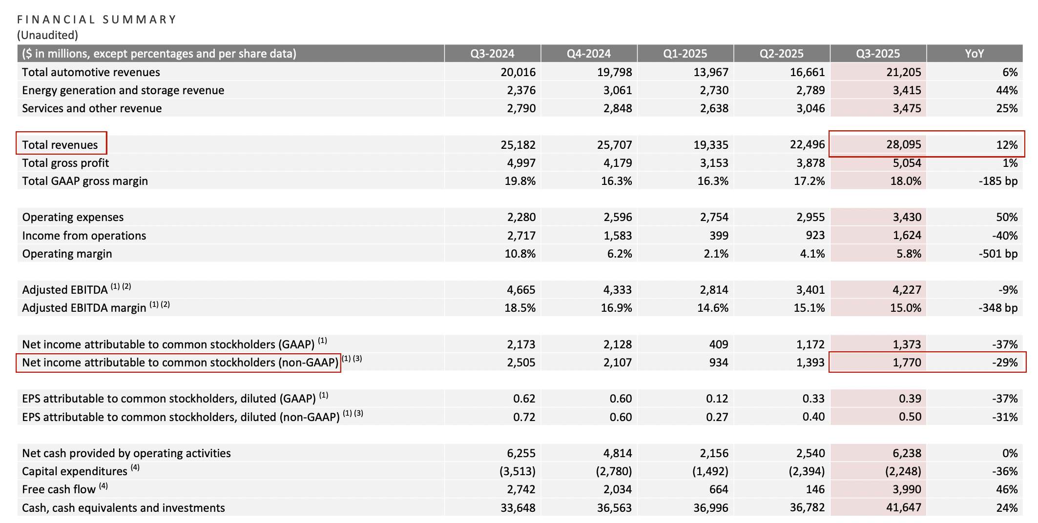 财报显示,特斯拉第三季度营收达到281亿美元,同比增长12%,高于分析师预期的263.7亿美元;净利润为17.7亿美元(非美国通用会计准则下),同比下滑29%,经调整后的每股收益为0.50美元,低于分析师预期的0.54美元。