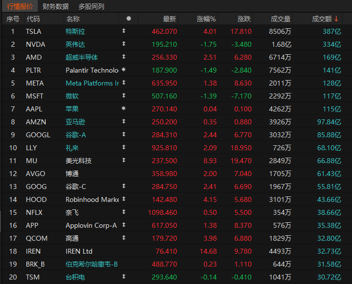 第3名AMD收高2.51%,成交169亿美元。该公司第三季度业绩超预期,并预计第四季度营收约96亿美元,但在人工智能推动大幅上涨后,过高期望和利润率担忧一度令该股承压。