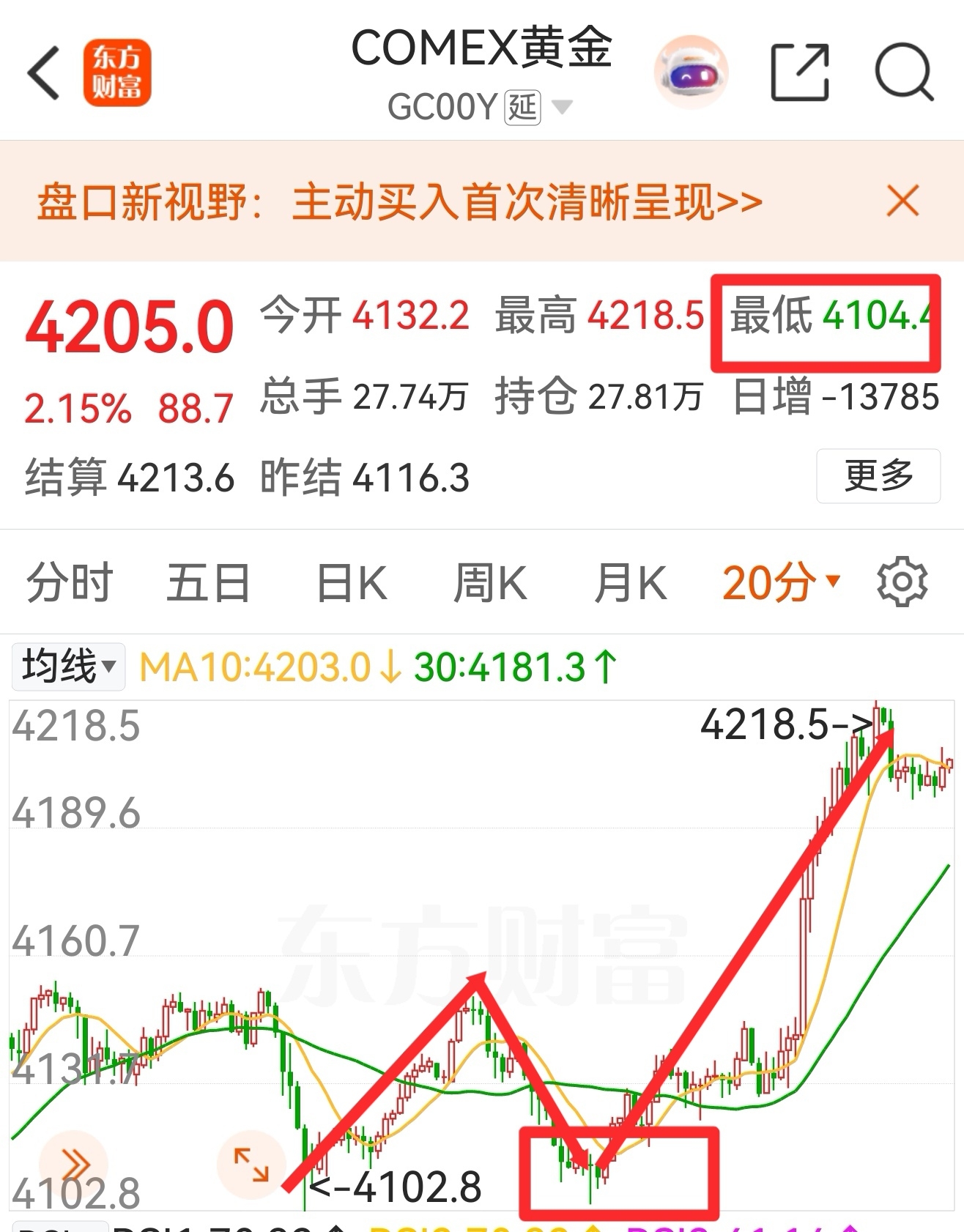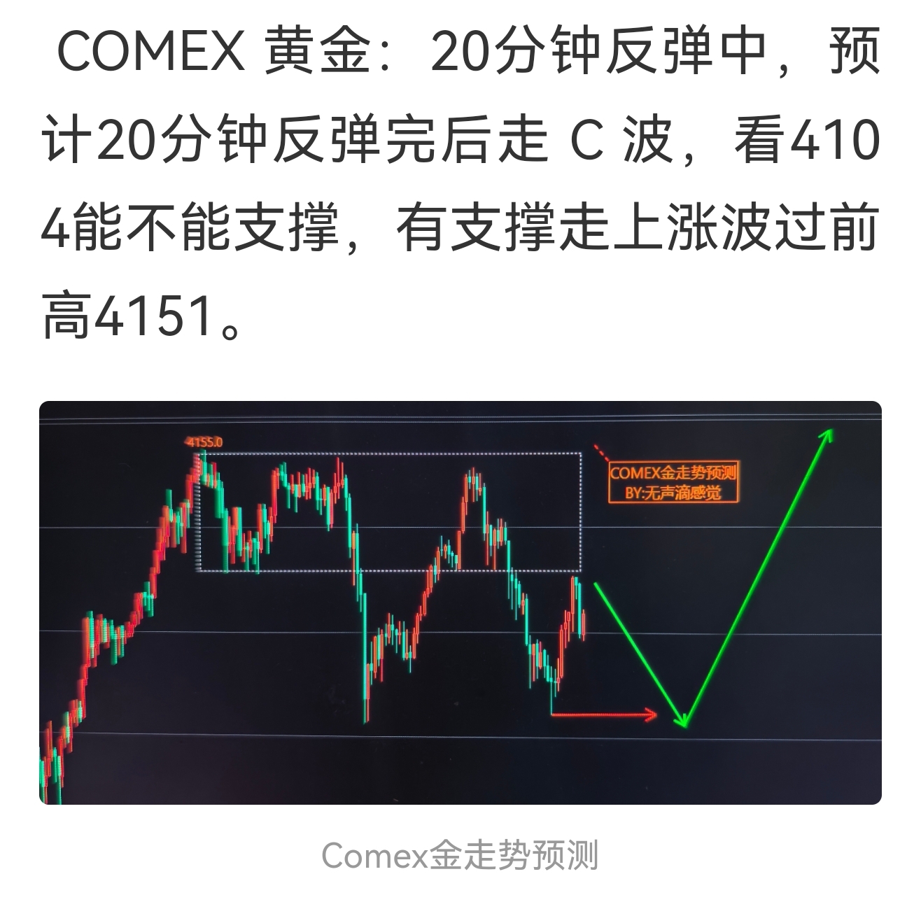 原文欣赏:“COMEX 黄金:20分钟反弹中,预计20分钟反弹完后走 C 波,看4104能不能支撑,有支撑走上涨波过前高4151。”