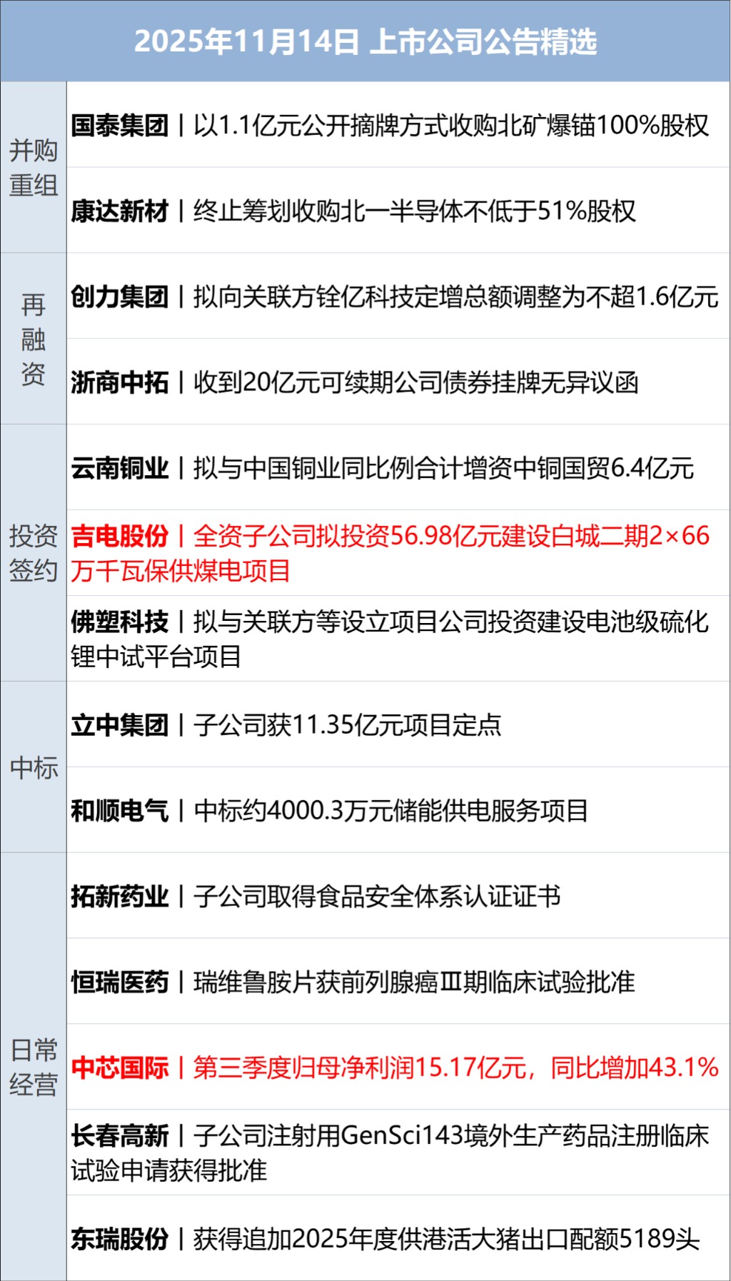 恒大汽车(HK00708,股价0.17港元,市值18.43亿港元):11月13日晚间,恒大汽车在港交所公告,公司已收到来自天津市滨海新区人民法院的裁决。根据该裁决,法院已受理债权人对公司之间接全资附属公司恒大新能源汽车(天津)有限公司(“相关附属公司”)的破产及清算呈请。相关附属公司的注册股本为人民币41亿元,且为集团于天津拥有智能出行产品生产设施的制造基地的注册拥有人,基地的生产已自2024年1月起暂停。公司股份将继续暂停买卖,直至另行通知。