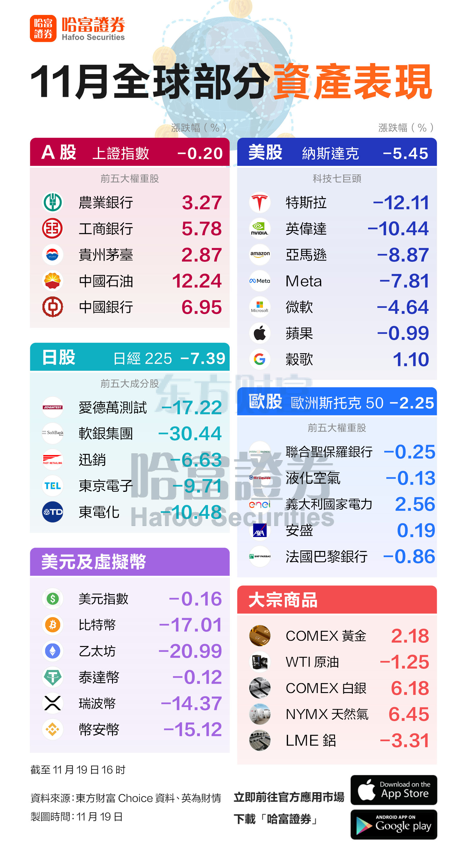 进入11月以后,全球金融市场动荡,美股、日股、欧股、虚拟币、A股等全球主要资产均出现调整。截至北京时间11月19日16时,纳指当月跌超5%,日经225大跌7.39%,欧洲斯托克50下跌2.25%,沪指及恒指微跌约0.2%,比特币当月暴跌17%。