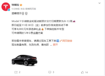 特斯拉:Model Y长续航全轮驱动版预计交付日期更新为8-13周