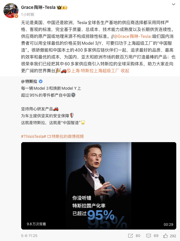 特斯拉陶琳:供应商原产国或地理来源不构成排除性标准
