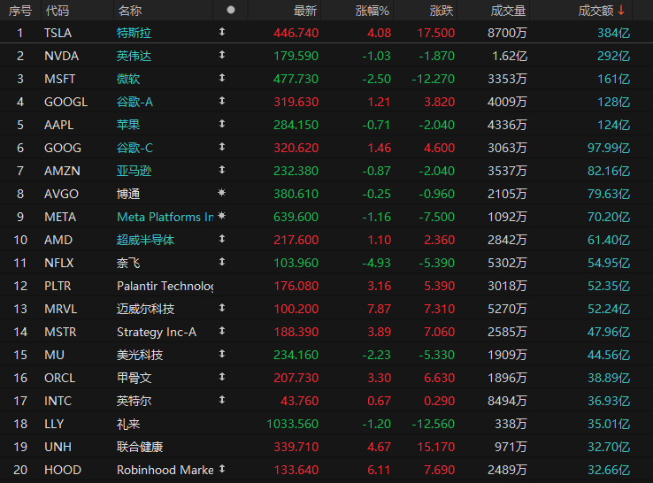 周三美股成交额第1名特斯拉收高4.08%,成交385亿美元。消息面上,在发布加速人工智能发展计划五个月后,特朗普政府开始将目光转向机器人。知情人士透露,商务部长卢特尼克一直在与机器人行业的首席执行官们会面,并“全力以赴”地加速该行业的发展。特朗普政府正在考虑明年发布一项关于机器人技术的行政令,交通部也正准备宣布成立一个机器人工作组,可能在年底前公布。
