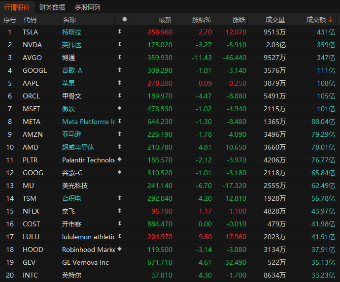 美股成交额前20:博通收跌11.43% 公布的人工智能市场销售展望未达投资者的高预期