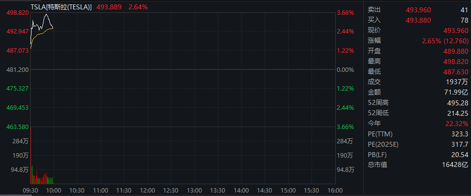 其中,特斯拉盘中一度涨超3.5%,股价最高至498.82美元/股,创历史新高。截至发稿,公司总市值超过1.64万亿美元。