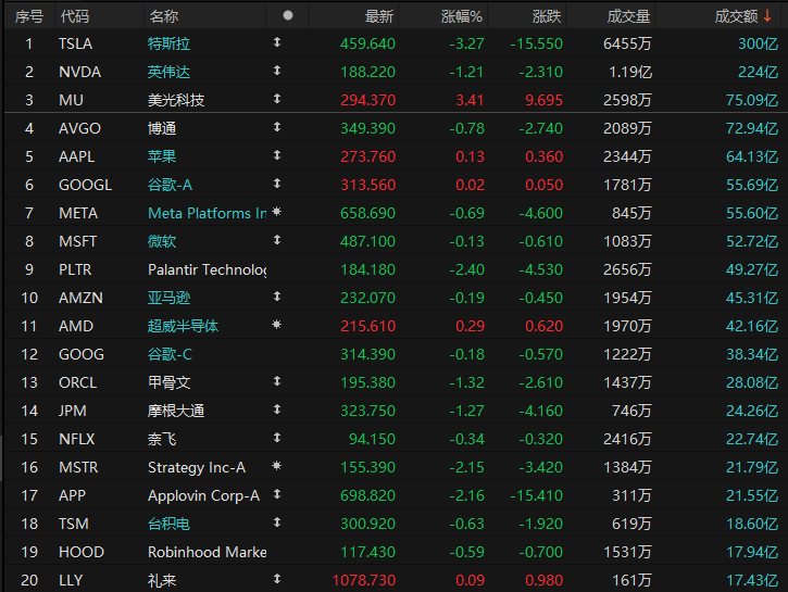 第3名美光收高3.41%,股价创新高,成交75.09亿美元。日前券商韦德布什(Wedbush)称该公司的服务器与存储芯片需求尚未出现放缓迹象。