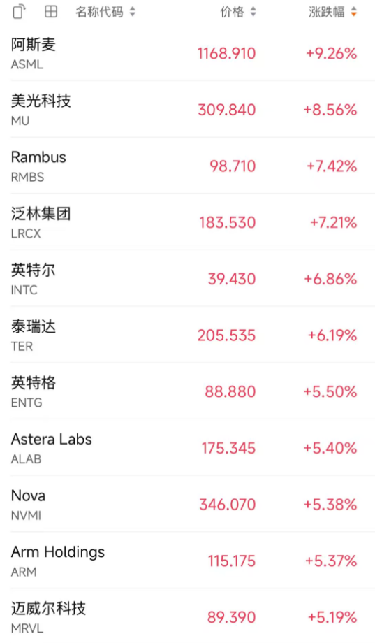 硬件股大涨,费城半导体指数大幅走高,现涨超3%;阿斯麦涨超9%,盘中创历史新高;美光科技涨超8%。