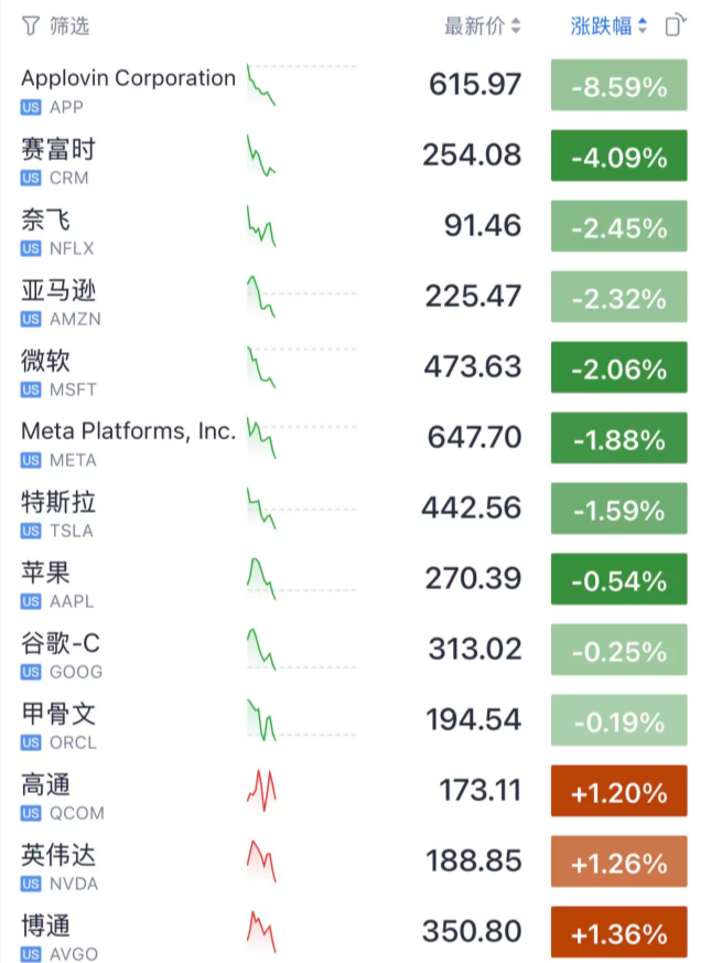 纳指的跳水,应该是受到了AI软件概念股的影响。亚马逊、微软跌超2%,Meta跌近2%,苹果股价也在不断跳水。