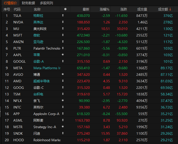 第3名美光收高10.51%,股价创历史新高,成交130亿美元。券商伯恩斯坦将美光科技目标价从270美元上调至330美元。