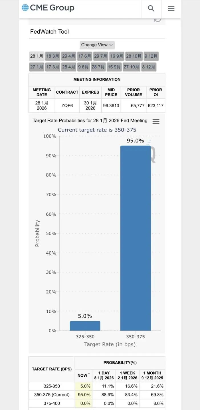 据CME“美联储观察”,非农数据公布后,美联储1月降息25个基点的概率为5%(公布前为11.1%),维持利率不变的概率升至95%(公布前为88.9%)。