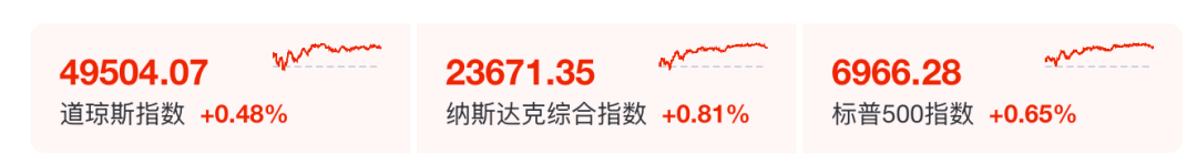 昨夜今晨,美股三大股指全线收涨。截至收盘,道琼斯工业平均指数涨0.48%,报49504.07点;标普500指数涨0.65%,报6966.28点;纳斯达克综合指数涨0.81%,报23671.35点。